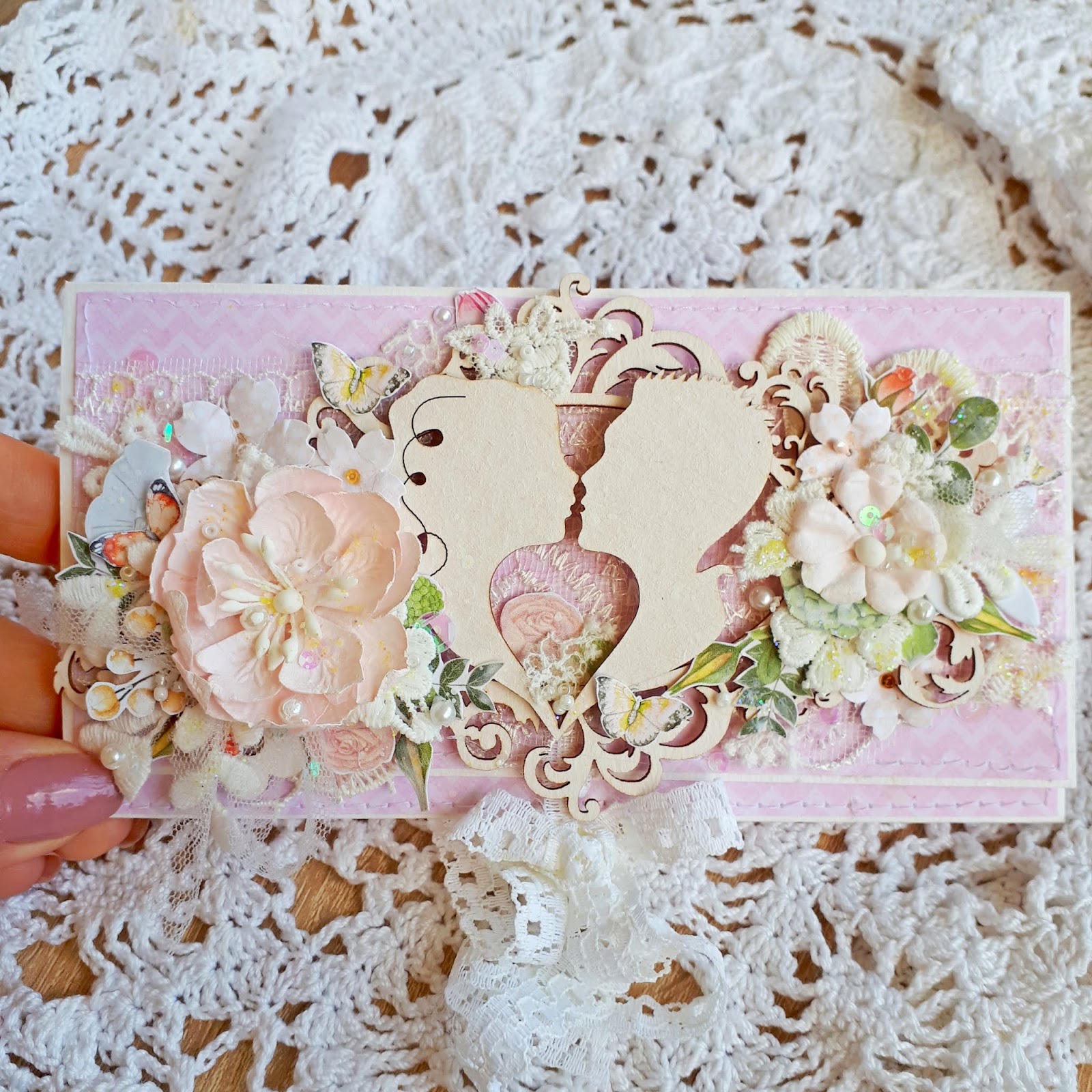 Чіпик з молодятами я припідняла на гарнезну мереживну рамку і тепер вони мовби парять в повітрі, що додало легкості та повітряності композиції.
