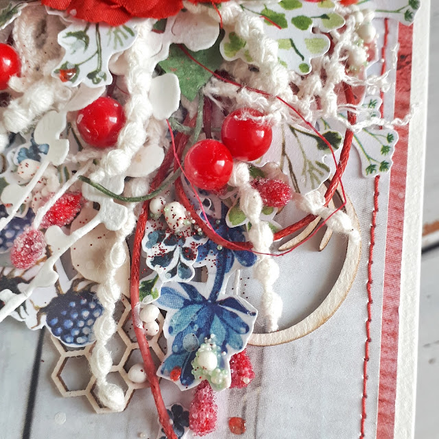 Не усі люблять червоний колір, а дехто його щей боїться). Він один з найулюблених моїх кольорів, тому це завдання стало для мене дуже легким та приємним. Червоний колір я обрала для акцентів, так як робити усю листівку червоною не ризикнула). Окрім червоної квітки, тодала ягідки, шнурок, тичинки червоного кольору.
