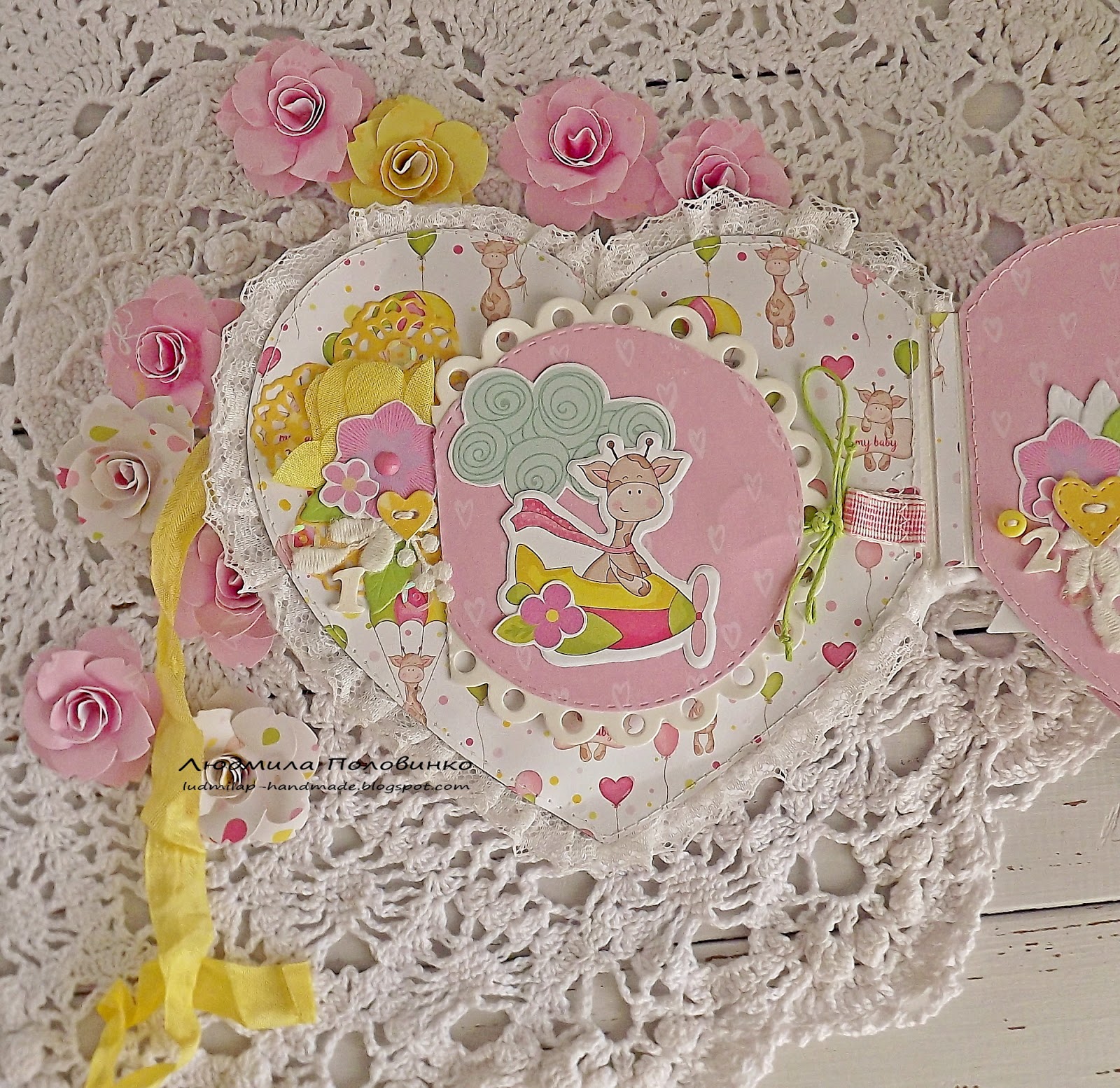 В роботі я використовувала ніжну колекцію паперу "Моя малышка", висічки і фішки. Висічки гарно підходять для створення міні альбомів, в них ідеальний розмір, і їх кількість в наборі дуже радує.