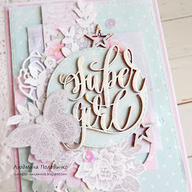 Своє натхнення я черпаю в матеріалах, які люблю перебирати та уявляти, що б можна було з цим зробити. Якось, як я знову гортала свої запаси чіпборду від Скрап Радість, я надихнулася чіпиком написом супер дівчина. І вирішила, що це має бути ніжна та романтична листівка. Приступаючи до роботи я не уявляла кінцевого результату, все починає вимальовуватися вже в процесі роботи. Я розкладаю на столі те, що хотіла використати у своїй роботі, збираю композицію і якщо мене все влаштовує приступаю до склеювання. Але не завжди буває все так легко і гладко). Іноді, композиція ніяк не складається, щось в ній є те, що не подобається, а що саме ти не знаєш. В таких випадках, я скидаю увесь декор і збираю по новому. А іноді і залишаю все в спокої на ніч, а вже зранку свіжими силами сідаю творити. Але цього разу композиція склалась швидко і легко. Саме така творчість і приносить найбільше задоволення.